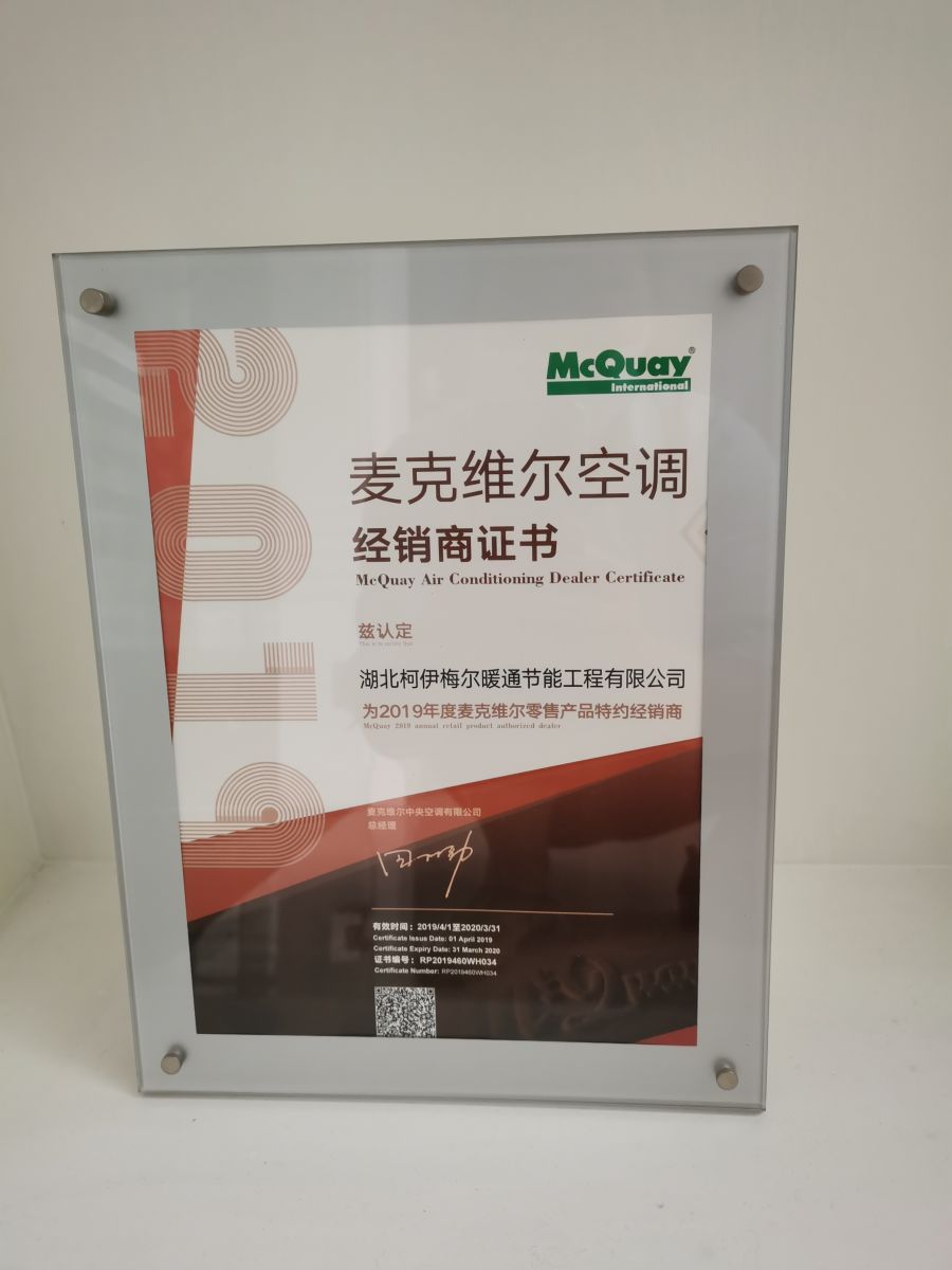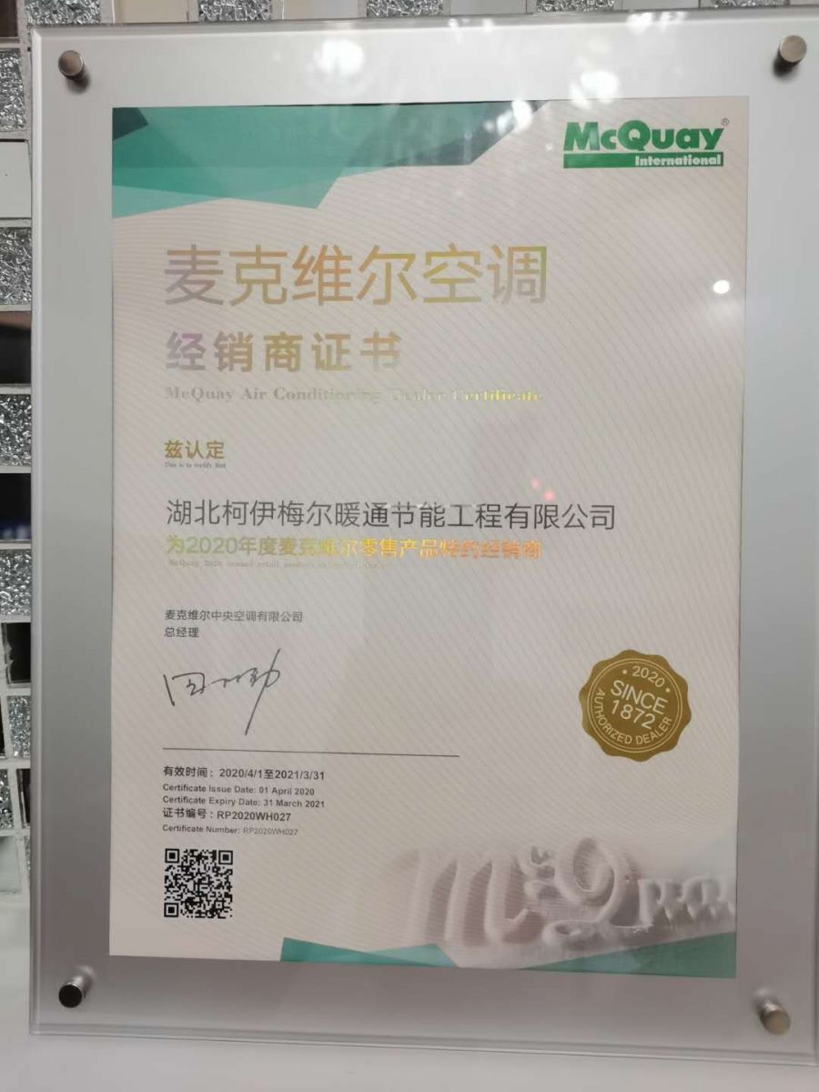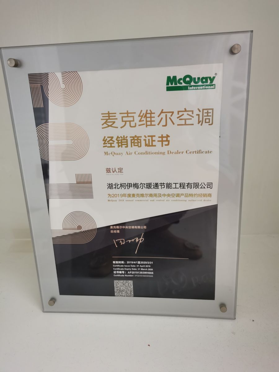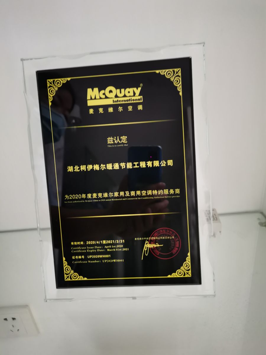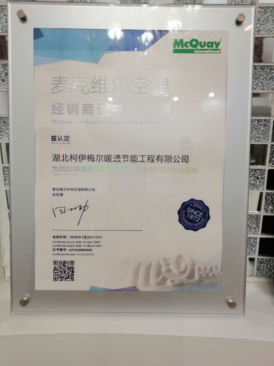 麥克維爾授權(quán)柯伊梅爾“年度商用及中央空調(diào)產(chǎn)品特約經(jīng)銷商證書”